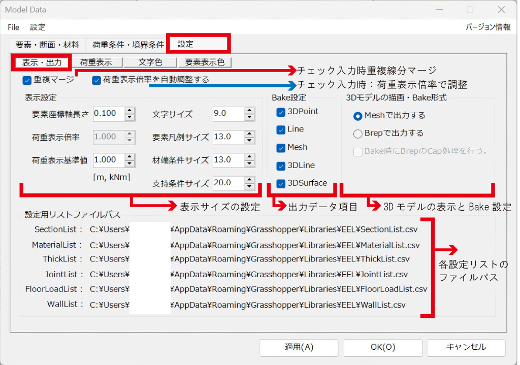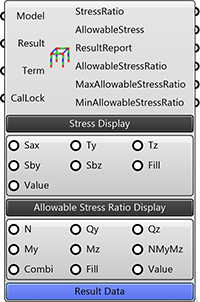 | EEL>Analysis>Section Calculation Section Calculationコンポーネント ![]() ![]() | 断面算定を行うコンポーネント。 Solverコンポーネントで解析された結果に対して、RC、S、Wの断面算定を行います。 コンポーネントの下部にはボタンがあり、[Stress Display]では応力度、[Allowable Stress Ration Display]では断面算定の結果描画表示の切替。 [Result Data]からは結果の一覧表が確認できます。 アウトプットは、部材番号ごとに階層がわかれ、階層内は対応するResultDataと同じ順番で出力されます。 Input
