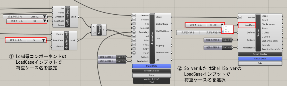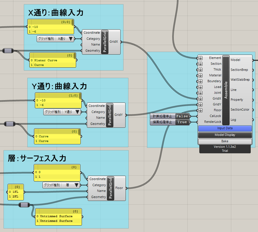 | EEL>Load>Floor Load Floor Loadコンポーネント ![]() ![]() | 解析モデルの床荷重をサーフェス(Brep)から作成するコンポーネント。 BeamCountが0の時、Solverで解析可能です。 Input