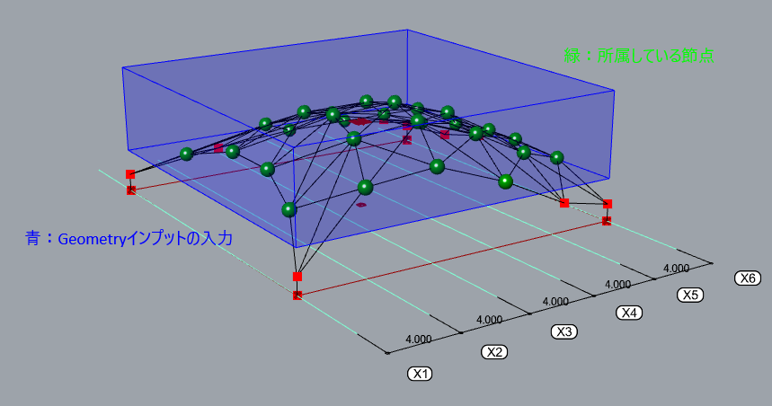 | EEL>Model>Boundary Boundaryコンポーネント ![]() ![]() | 解析モデルの境界条件を点データから作成するコンポーネント。 Pointに点を入力することでDX以下のインプットに自動でBoolean Toggleコンポーネントが自動で配置されます。 境界条件の変更は自動で配置されたBoolean Toggleコンポーネントで切り替えます。 またコンポーネントの下部のラジオボタンでは設定した境界条件を表示しています。 ラジオボタンでの入力切替はできません。 Input
