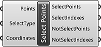 | EEL>Utility>Select Points Select Pointsコンポーネント ![]() ![]() | 指定した座標値、座標範囲あるいは平面上にある点を抽出するコンポーネント。 Input