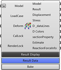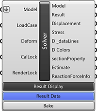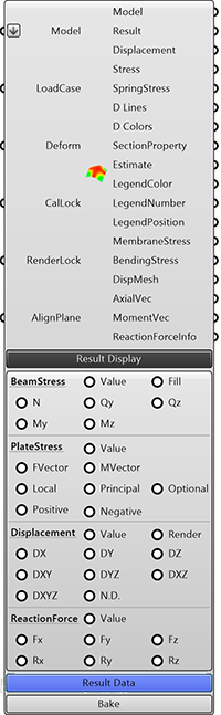 | EEL>Analysis>Solver Solverコンポーネント ![]() ![]() | 梁要素の弾性応力解析を行うコンポーネント。 コンポーネントの下部にはボタンがあり、[Result Display]では解析結果の描画表示の切替、[Result Data]からは結果の一覧表が確認できます。 アウトプットは、部材番号ごとに階層がわかれ、階層内は対応するResultDataと同じ順番で出力されます。 Input