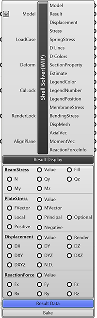 | EEL>Analysis>Shell Solver Shell Solverコンポーネント ![]() ![]() | 梁要素・板要素の弾性応力解析を行うコンポーネント ※開発中のコンポーネントです。 コンポーネントの下部にはボタンがあり、[Result Display]では解析結果の描画表示の切替、[Result Data]からは結果の一覧表が確認できます。 アウトプットは、部材番号ごとに階層がわかれ出力されます。 Input