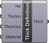 | EEL>Model>Thick Definition Thick Definitionコンポーネント ![]() ![]() | 板厚情報を定義するコンポーネント。 各Inputの対応関係はコチラを参照ください。 Input